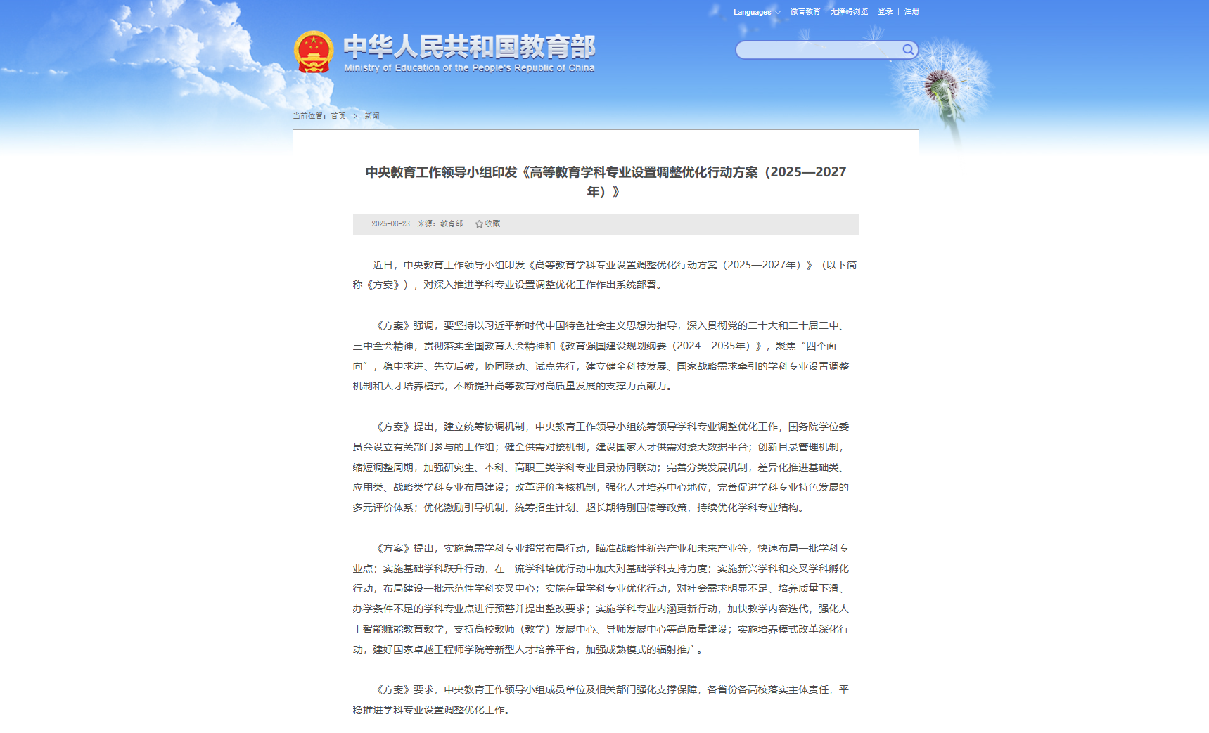 近日,中央教育工作領(lǐng)導(dǎo)小組正式印發(fā)《高等教育學(xué)科專業(yè)設(shè)置調(diào)整優(yōu)化行動(dòng)方案(2025—2027年)》,對(duì)未來(lái)三年我國(guó)高等教育的“專業(yè)地圖”進(jìn)行系統(tǒng)性擘畫(huà)。這標(biāo)志著一場(chǎng)旨在增強(qiáng)教育服務(wù)國(guó)家戰(zhàn)略能力的深刻結(jié)構(gòu)性改革已全面啟動(dòng)。